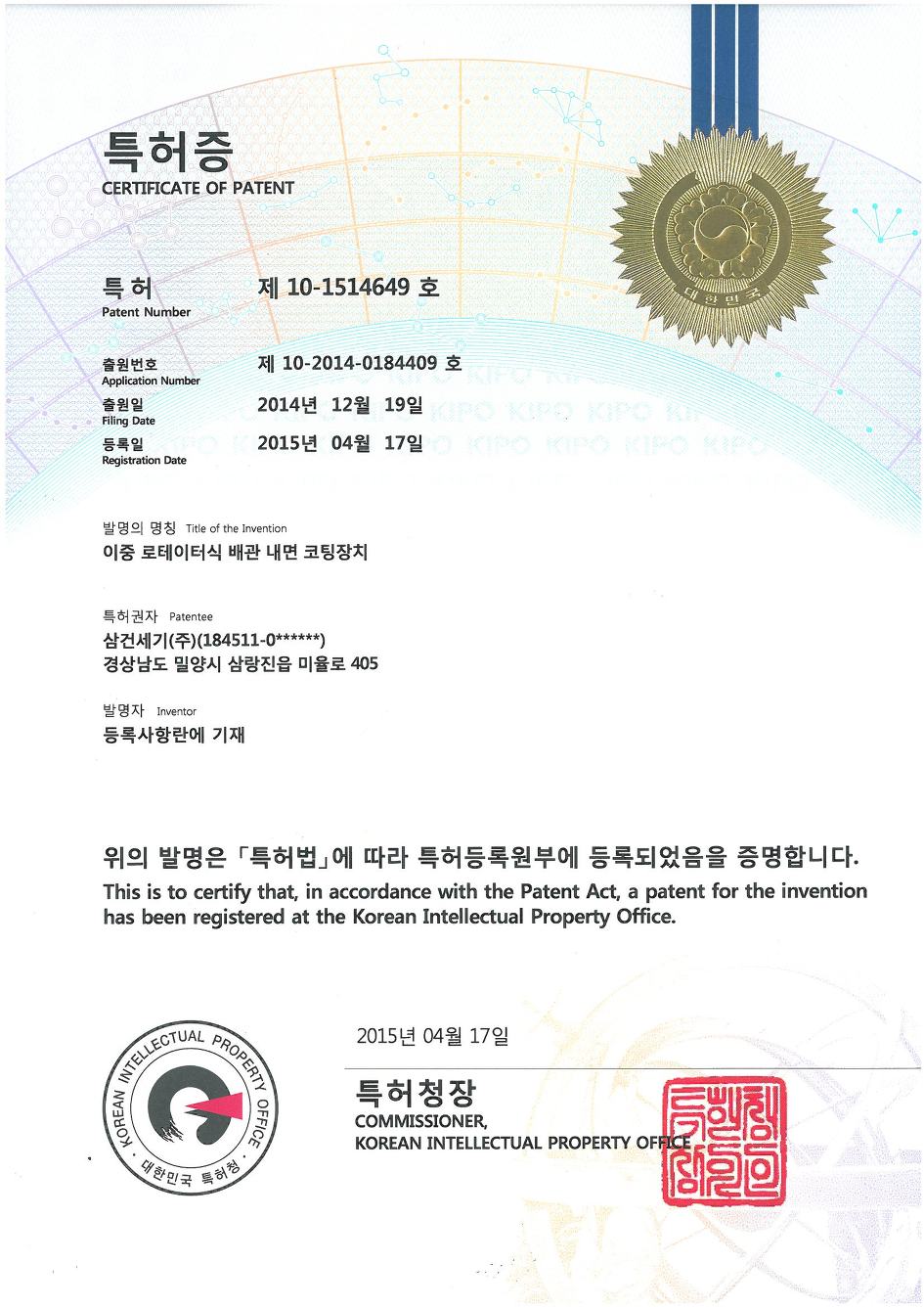 SAMKUN CENTURY Co.,Ltd. was achieve 'Certificate of patent - Piping double rotary interternal coating system' by KOREAN INTELLECTUAL PROPERTY OFFICE on 17th April